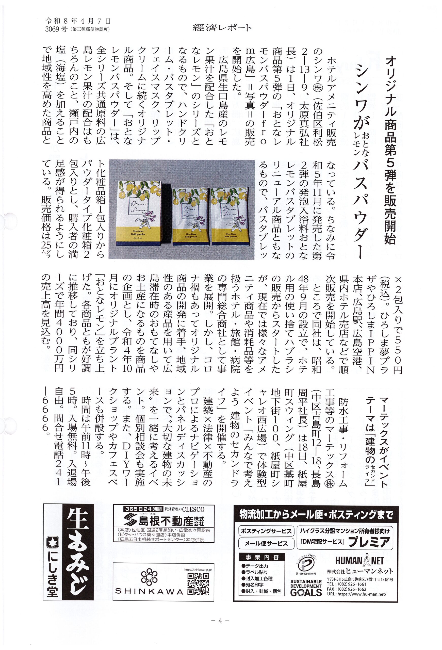 【記事掲載】経済レポート『おとなレモンバスパウダー』 投稿日:2026年4月16日 |お知らせ おとなレモンシリーズの新商品『おとなレモンバスパウダー from広島』について、経済レポートさんに取材をいただきました。 取り扱い店舗拡大中です。ぜひお試しください! « 前の記事へ